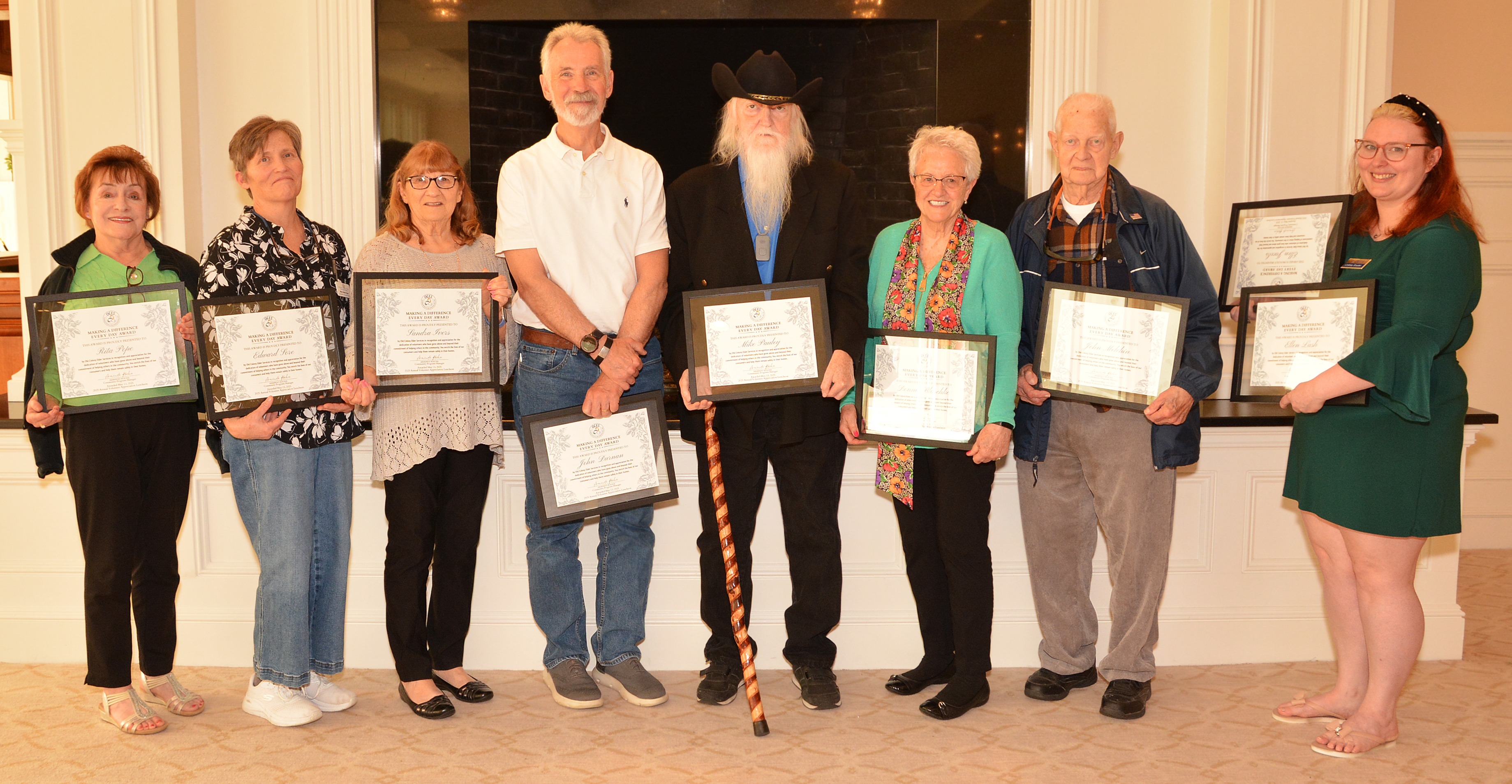 Left to right: Rita Pope, Mary Beth Ryan from Plymouth Center for Active Living accepting the award on behalf of Edward Sore, Sandra Ivers, John Durnan, Mike Pauley, Donna Blaschke, John Melchin, and Lindsey Snyder from OCES’ Money Management Program accepting the awards on behalf of Ellen Jacobs and Ellen Lash.